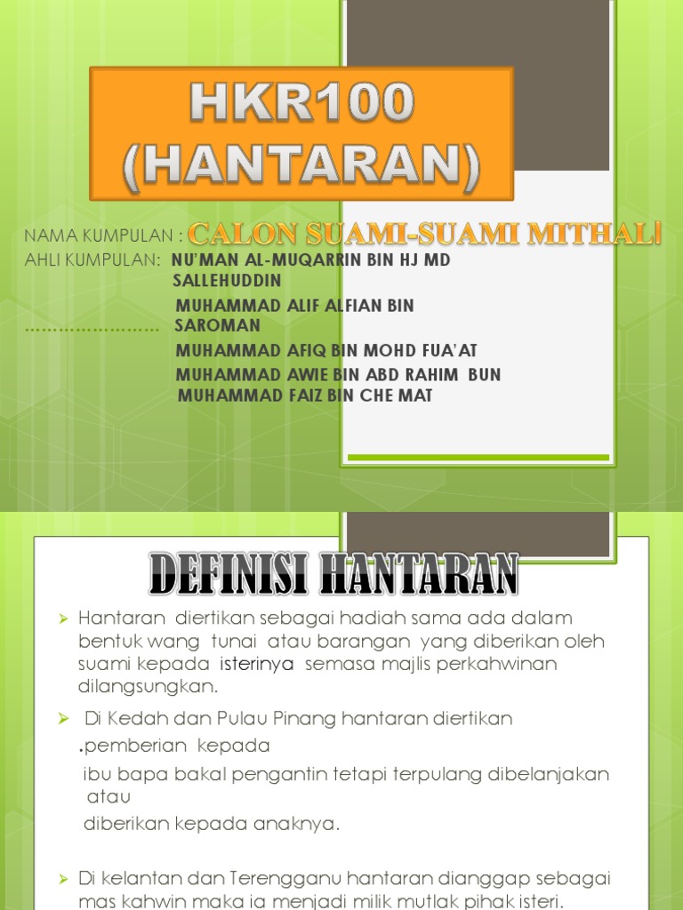 Pemuda yang berusia 24 tahun yang bertugas sebagai seorang. Hantaran pernikahan sepatu dan tas. Hantaran seserahan menjadi salah satu bagian dari prosesi pernikahan. Barang barang inilah yang disebut dengan hantaran pernikahan. Adakah wang hantaran wajib dibayar?