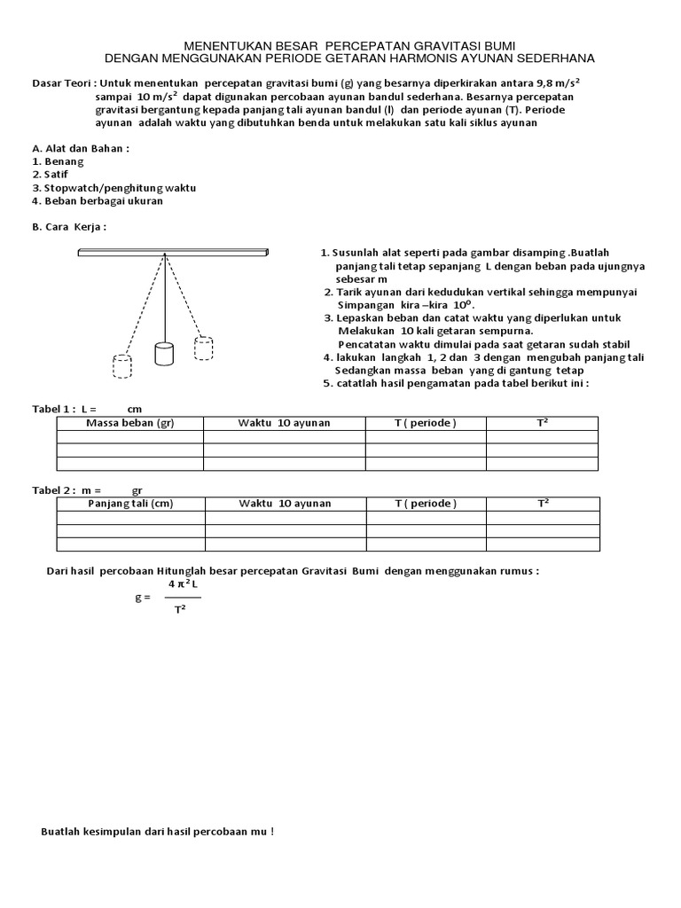 Gerakan ayunan bandul sederhana berkaitan dengan panjang tali, sudut awal, massa bandul, amplitudo, dan periode ayunan. Percobaan ayunan bandul fisis bertujuan untuk menentukan suatu besaran fisis, misalnya percepatan gravitasi bumi atau momeninersia pusat massa suatu benda. We are a sharing community. Praktikum ayunan bandul sederhana ditambah mereka penasaran ingin mengetahui jawaban dari hipotesis yang mereka ajukan, itulah yang menyebabkan sehingga peserta didik mampu mengamati. Ayunan bandul sederhana dapat dibuat menggunakan sebuah bola yang diikat tali dan tergantung pada sebuah bidang tetep.