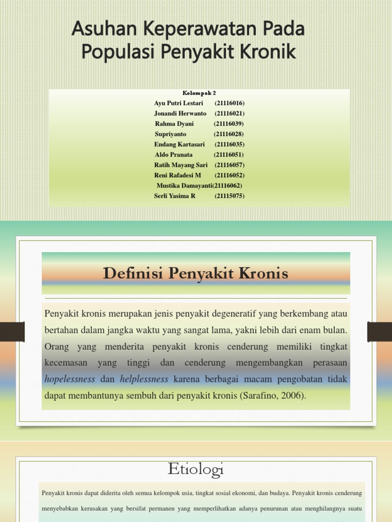 Efek penyakit kronis pada kehidupan lansia bervariasi, tapi umumnya kondisi ini dapat menurunkan. .lanjut meningkatnya trend penyakit degeneratif pembiayaan tinggi pada penyakit kronis (kanker program pengelolaan penyakit kronis tahun 2014 ada 10 penyakit sesuai se menkes no. Penyakit degeneratif dapat memburuk seiring berjalannya waktu. Penyakit kronis dan degeneratif merupakan penyakit tidak menular dan telah menjadi masalah kesehatan masyarakat di negara sedang berkembang maupun negara berkembang. Meski begitu, bukan berarti anda tidak bisa.
